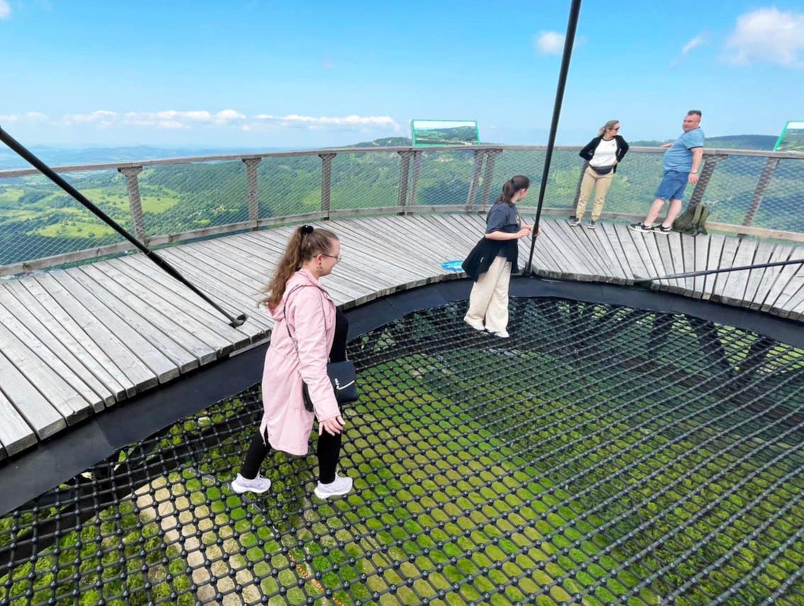Na szczyt wieży, mimo jej wysokości dostaniemy się bez żadnego wysiłku, łagodnymi serpentynami dostępnymi także dla osób na wózkach. Widok z góry zapiera dech w piersiach, a ludzie odczuwający lęk wysokości mogą poczuć się ciut nieswojo. Ten, kto potrzebuje większej dawki adrenaliny i 55 metrów powietrza pod stopami, może zaś stanąć – albo nawet poleżeć – na bujającej się sznurowej siatce. Z wierzchołka wieży dokładnie zobaczymy całą bliższą i dalszą okolicę: Śnieżnik, Karkonosze ze Śnieżką, dolinę rzeki Morawy, piękne lasy.